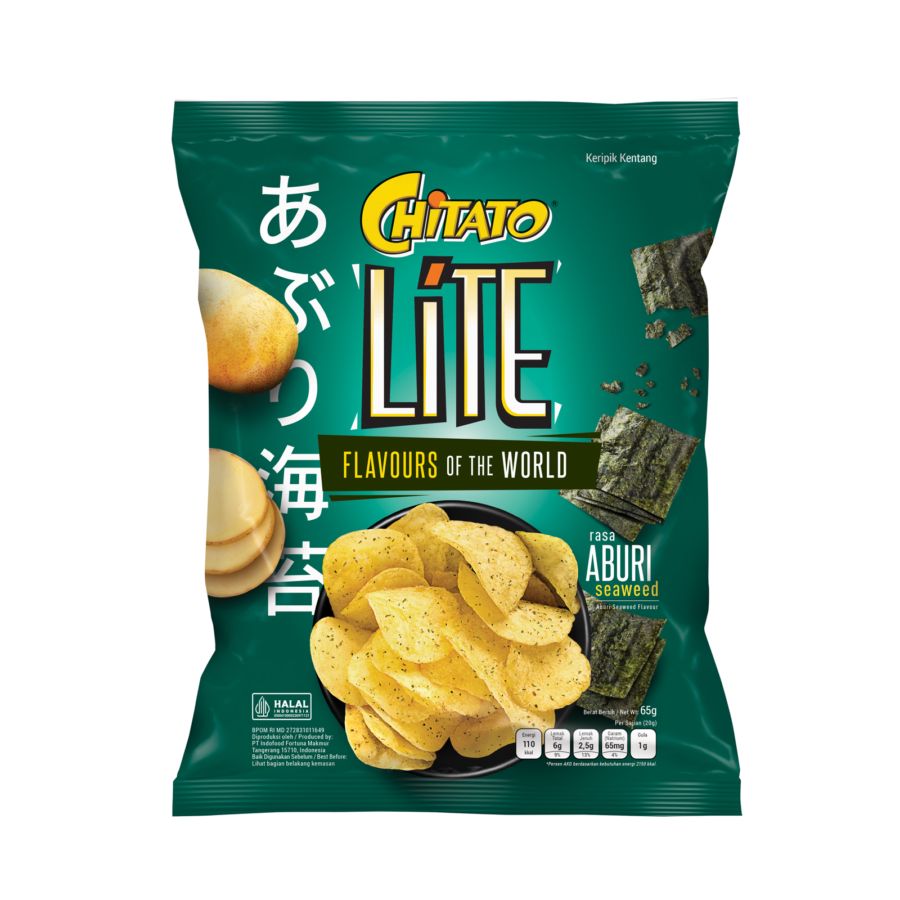 Chitato Lite Aburi Seaweed (65g) features thinly sliced, crispy real potato chips seasoned with a savory, slightly smoky “aburi” (Japanese-style seared) seaweed flavor. Launched by Indofood as a lighter, crunchy snack, it delivers a unique, savory taste inspired by Japanese cuisine.