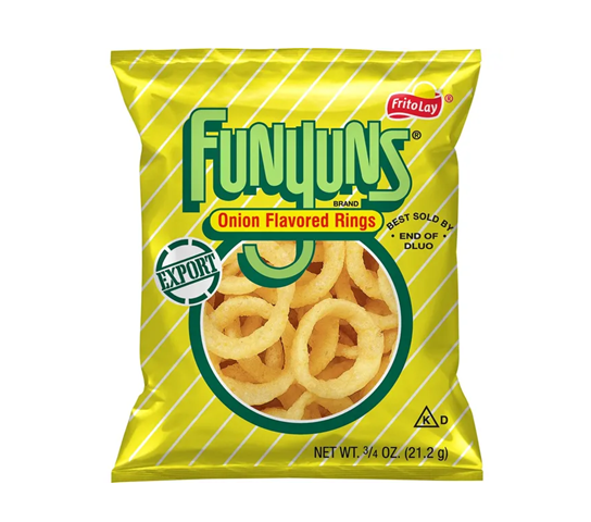 Funyuns Onion Flavored Rings 21.2g are a popular, crunchy, corn-based snack that mimics the taste and shape of fried onion rings. They are characterized by a zesty onion flavor, airy texture, and are designed for on-the-go snacking or as a flavorful alternative to potato chips.