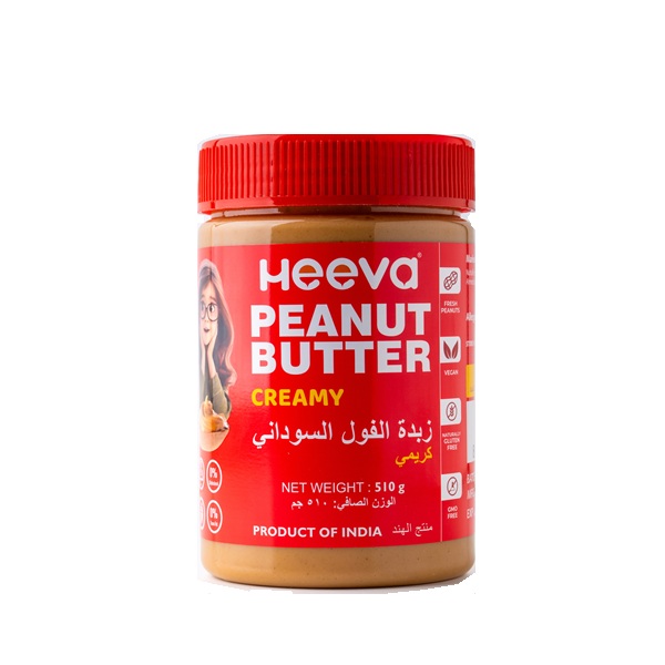 Heeva Creamy Peanut Butter is a high-protein (approx. 26-28g per 100g), gluten-free, and vegan spread made from 100% roasted peanuts. It features a smooth, velvety texture, with options for natural (no added sugar/salt) or classic (slightly sweetened) varieties. It is cholesterol-free, non-GMO, and contains no artificial additives.