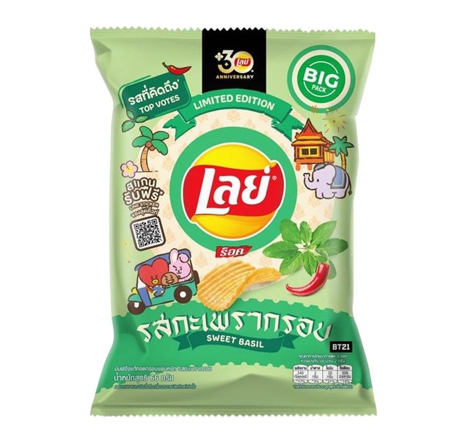 Lays Ridged Sweet Basil chips (44g) offer a unique Thai-inspired flavor: a refreshing mix of aromatic sweet basil with savory, umami notes and a slight chili heat, delivered in an extra-crispy, ridged cut for maximum crunch and flavor capture, making them a bold, herbaceous twist on classic potato chips perfect for adventurous snackers
