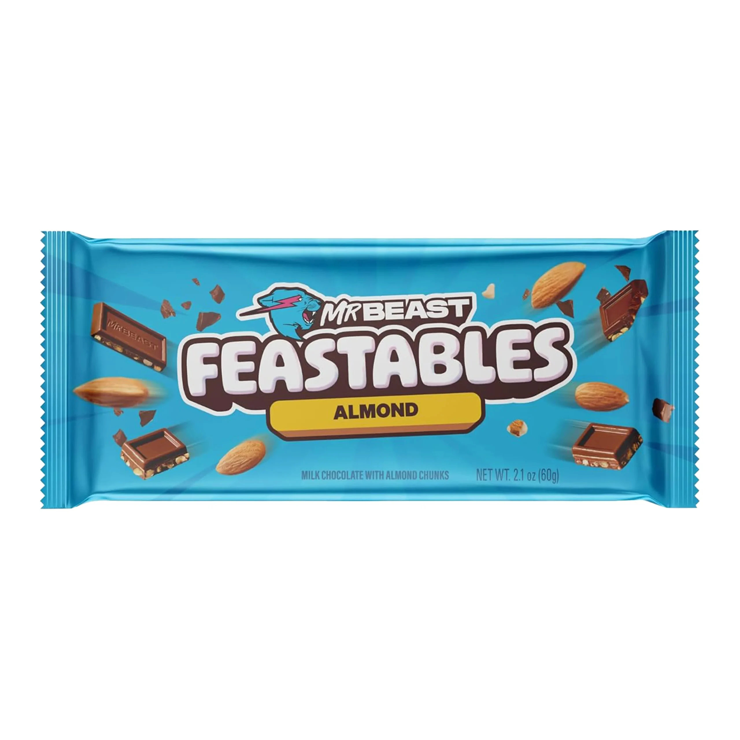 The MrBeast Feastables Almond 60g bar is a creamy milk chocolate bar, reformulated for a smoother, richer texture, blended with crunchy roasted almond chunks. Made with simple, high-quality ingredients, it features organic cocoa and provides a 160-calorie, nut-forward treat in a distinct blue wrapper.