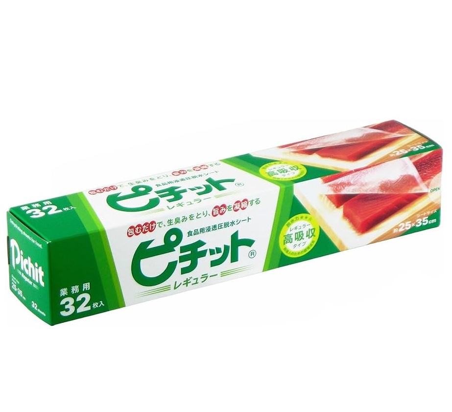 OKAMOTO Pichit Regular (32 sheets) are high-performance Japanese-made osmotic dehydrating sheets, sized (250mm X 350mm), designed for food preservation. These sheets remove excess moisture and odor from meat, fish, and vegetables, concentrating flavor for enhanced texture and quality. They are ideal for creating dried foods or maintaining freshness during storage