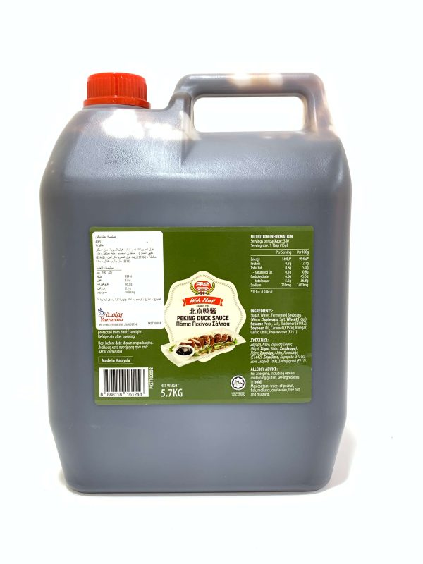 The Woh Hup Peking Duck Sauce is a rich, brown dipping sauce featuring a sweet, savoury, and tangy flavor profile, made with ingredients such as sugar, soybean paste, sesame paste, rice vinegar, and caramel coloring. This 5.7Kg ready-to-use sauce is designed to complement Peking duck and is also versatile enough to be used in other oriental dishes like wraps, spring roll dips, meat stews, and as a marinade for roast meats.
