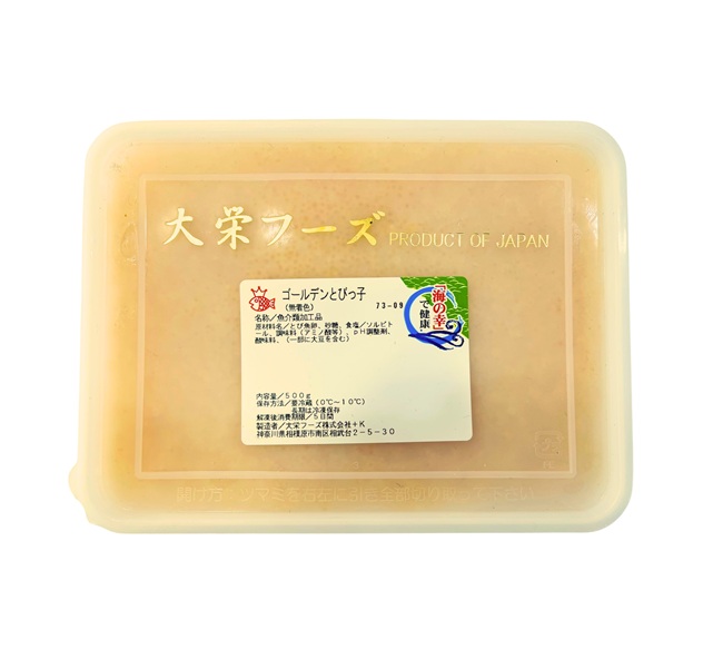 Seiwa brand Tobikko Yuzu Gold is seasoned flying fish roe that is infused with the refreshing essence of Japanese yuzu citrus. The “Gold” refers to its vibrant yellow color, which makes it a visually appealing garnish for various dishes.